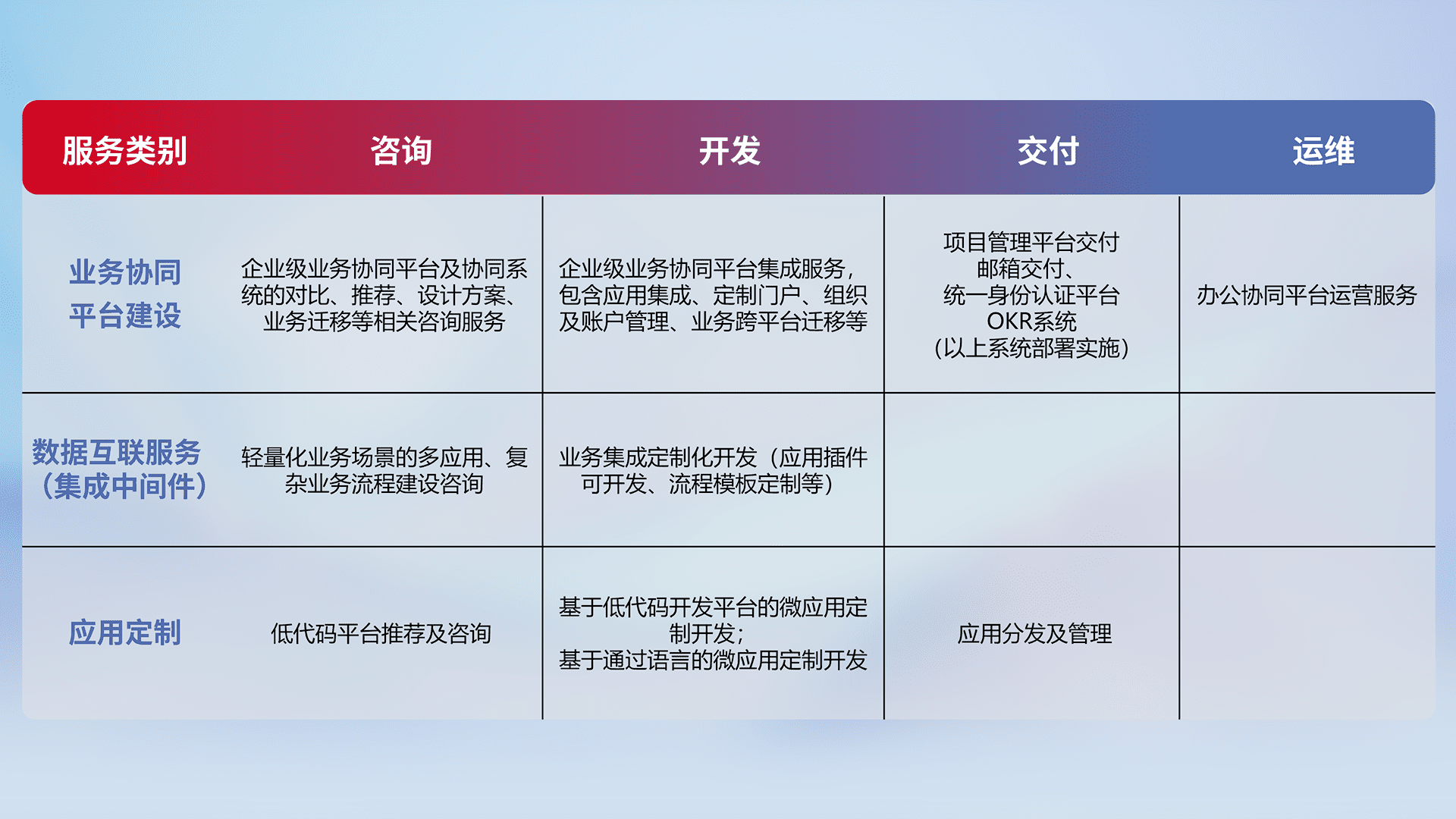 针对钉钉、、企微、、、、IDaas等平台级产品提供产品的规划、、方案、、、、交付、、、、定制化开发等服务,,,实现如统一协同办公、、智能客户服务、、混合会议管理、、智能数据查询、、、等业务场景,,,,实现数字化转型。。。。
